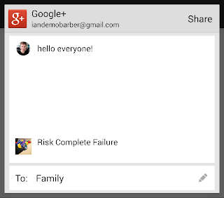 Its a little bit simpler than the primary share box, but does the job and allows users to share to their Google+ circles even when they don’t have the Google+ app installed on their device. Note that the Google Play Services share box only handles the “text/plain” type - so you can’t use it to share videos or images!
