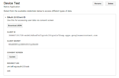 On the device, we first request a device sign-in with the scopes we want to access, and a client ID to identify the project. Note that the client ID must have been created in the API console as for devices. You can’t use the same client ID as for a site or a mobile app, though they can of course be in the same project.