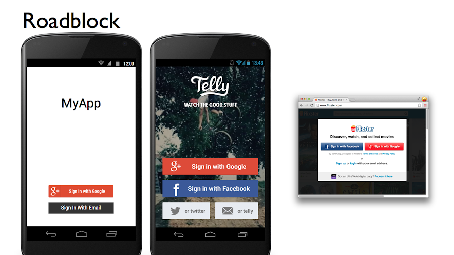 The two examples above are Telly (on Android) and Flixster (on the web). In both cases, the applications could offer experiences for signed-out users, but have made the decision to force their users to sign-in before accessing.